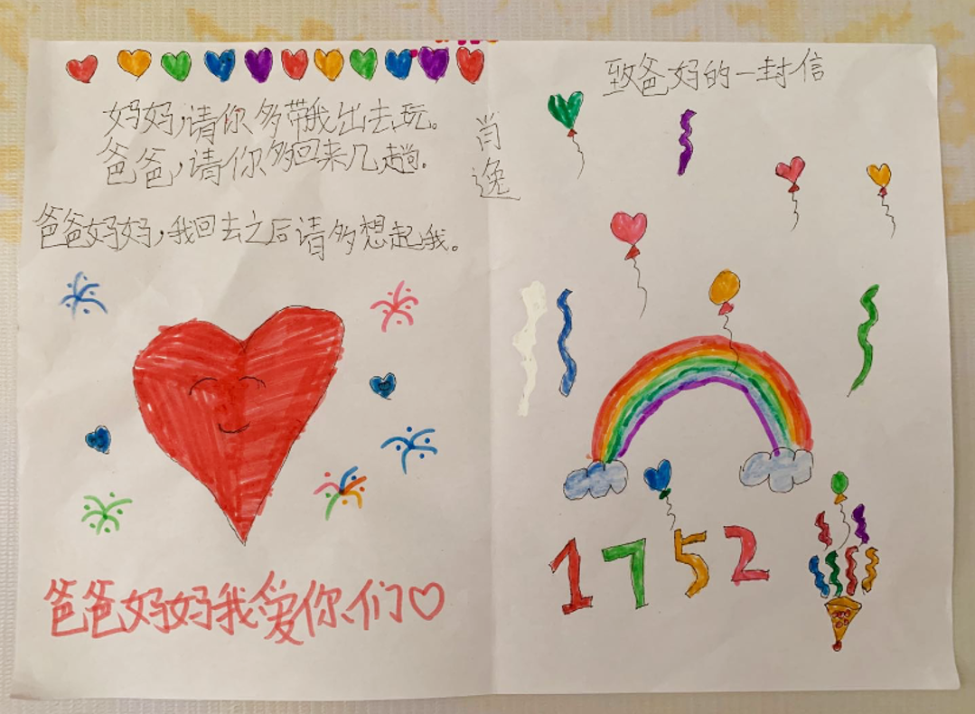 An 11-year-old boy’s letter to his parents, which writes “Mom, I wish you could take me out more often. Dad, please come back to visit us more often. Please often think of me after I return home.”