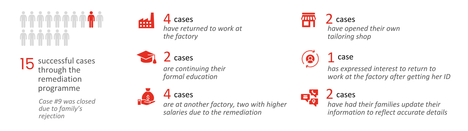 **One case was closed as unsuccessful because the family rejected assistance after only one month of remediation support. Their child stayed home and immediately rejoined the factory upon turning 16.