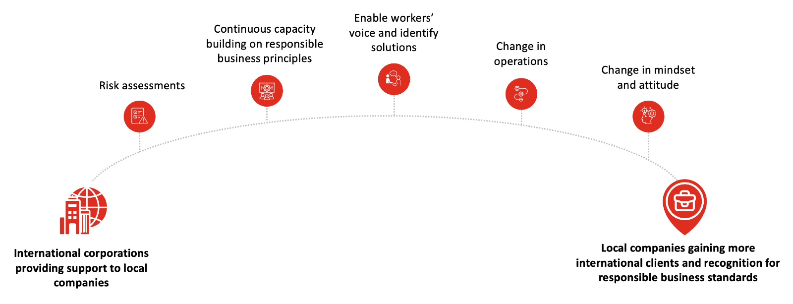 The interventions and leverage from international brands play a key role in shaping the strategies and practices of local contractors. By enhancing ESG standards and supporting their supply chain partners to embed these in their core business practices, global brands can drive significant, long-term change in their global supply chains.