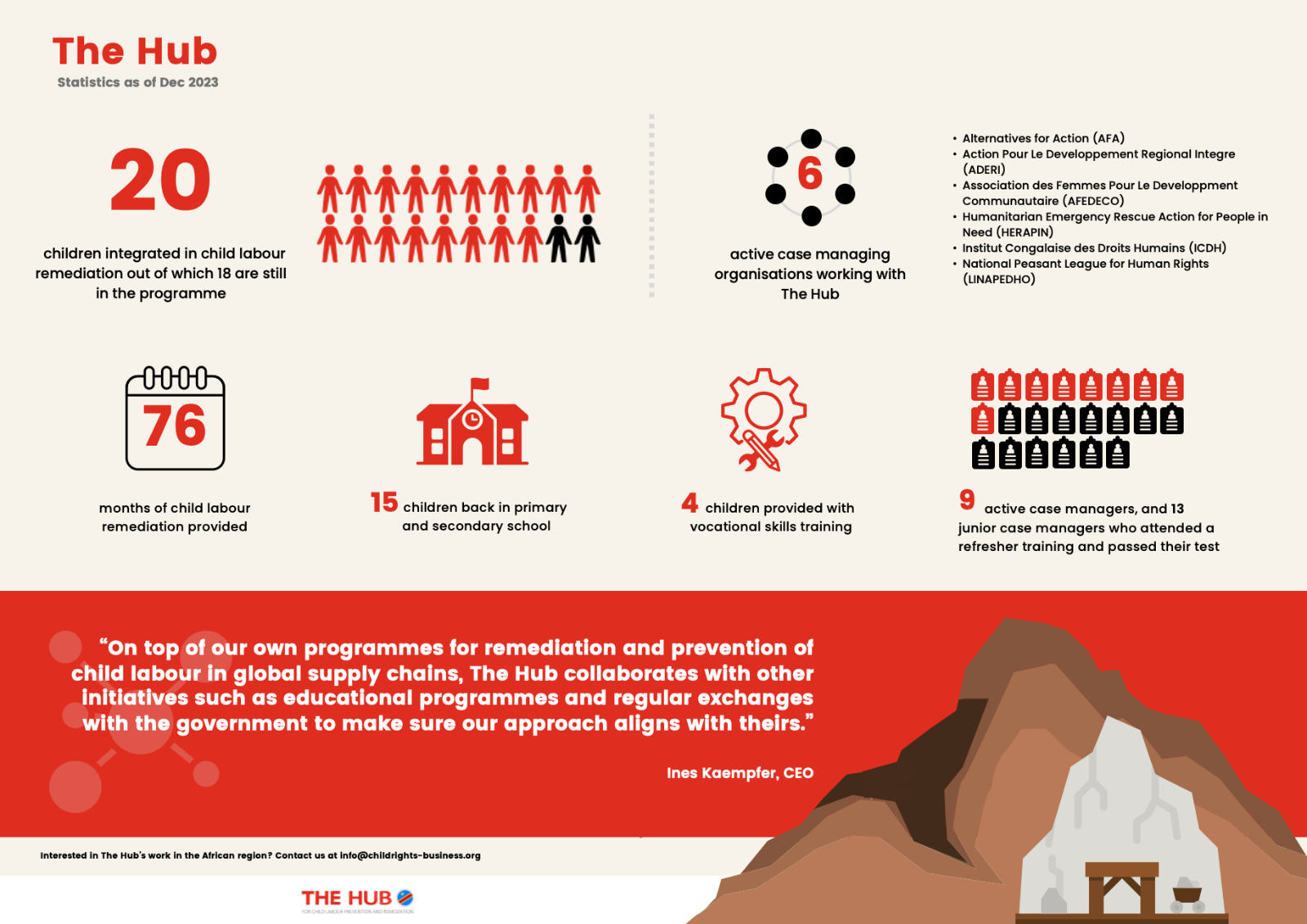 The Hub for Child Labour Prevention and Remediation – known simply as “The Hub” locally – was founded in 2022 by The Centre for Child Rights and Business, with support from the FCA and Save the Children Germany. The Hub, which operates in one of the DRC’s key mining hubs, Kolwezi, aims to drive systemic change to address child labour on and around artisanal and small-scale mining (ASM) sites over the long-term.