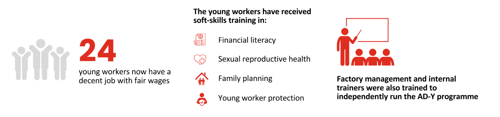 Our third workstream includes an Access to Decent Work for Youth (AD-Y) programme that connects young people in need of decent work to safe, well-regulated jobs in factories that adhere to labour laws and young workers’ rights. These factories are given capacity building and in-depth training to run the programme successfully over the long-term.