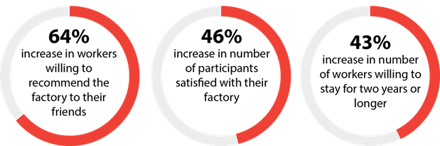 * Consolidated feedback from workers at 11 factories who took part in the CFS project in 2017. The impact was measured through pre-training and post-training questionnaires, worker interviews, and final evaluation surveys.