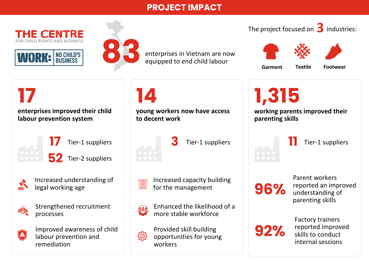 The Centre's work focused on preventing child labour in Vietnam’s garment, textiles, and footwear sectors, with efforts to strengthen the capacity and awareness of key stakeholders, including ensuring youth get access to decent work opportunities.