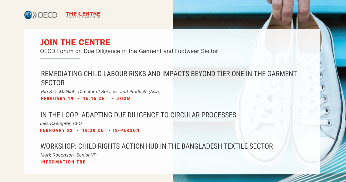 In addition to our physical presence at this year's OECD Forum on Due Diligence in the Garment and Footwear Sector in Paris, The Centre will also be featured in an online side event: Remediating Child Labour Risks and Impacts Beyond Tier One in the Garment Sector. Together with speakers from the International Labour Organization and GoodWeave International, our Director of Services and Products (Asia), Riri S.O. Malikah, will provide insights into our work, which predominantly focuses on the lower tiers of the supply chain where most incidents of child labour occur.
