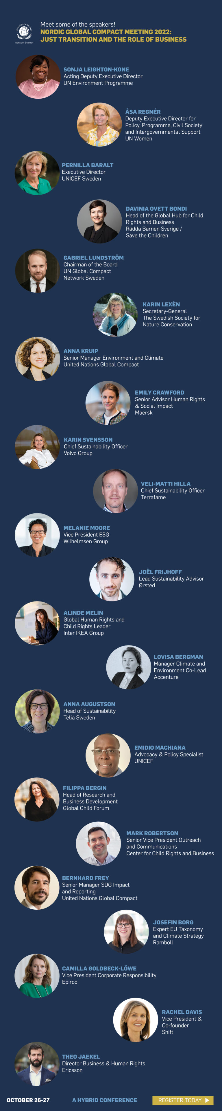 Organised by the Swedish Local Network, the panel discussion is part of the hybrid Nordic Global Compact Meeting, taking place in Gothenburg, Sweden, on October 26-27. Titled, “Just Transition and the Role of Business”, the conference focuses on ensuring a just transition in human rights and climate. To ensure a just transition, where both social, environmental and economic requirements are met, cooperation between different actors is crucial. No company can solve the many crises we are currently facing on its own. Therefore, the two-day conference will have a special focus on enabling collaboration, share experiences and brainstorm solutions around common challenges.