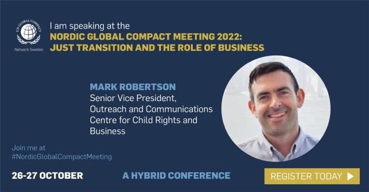 Tune in for the Nordic Global Compact Meeting’s panel session titled “From Best to Normal Practice: Children in Due Diligence, Mainstream Business and Just Transition” on October 27, Thursday from 11.00am - 12.30pm (Stockholm timezone, GMT+02:00). During this event, The Centre’s Senior Vice President of Outreach and Communications, Mark Robertson will join a discussion to share on the role of business and what businesses can do in strengthening children's rights. This panel discussion aims to shed light on children’s right in conjunction to the 10th anniversary of the Children's Rights and Business Principles.