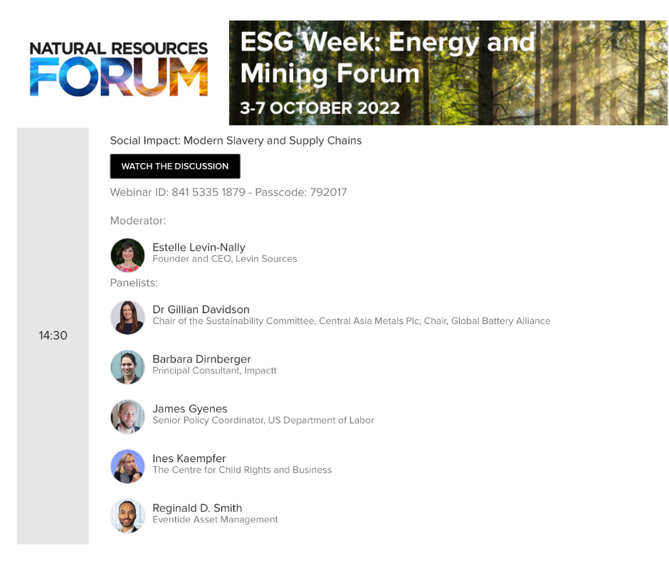 Join us for an online panel on "Social Impact, Modern Slavery and Supply Chains" for The Natural Resources Forum's ESG Week 2022: Energy & Mining Forum that will happen on Thursday, 6 October. During this event, The Centre's CEO Ines Kaempfer will join a panel discussion to share insights on child labour in the natural resources sector and the strategies to prevent, mitigate and remediate child labour risks in the value chain.