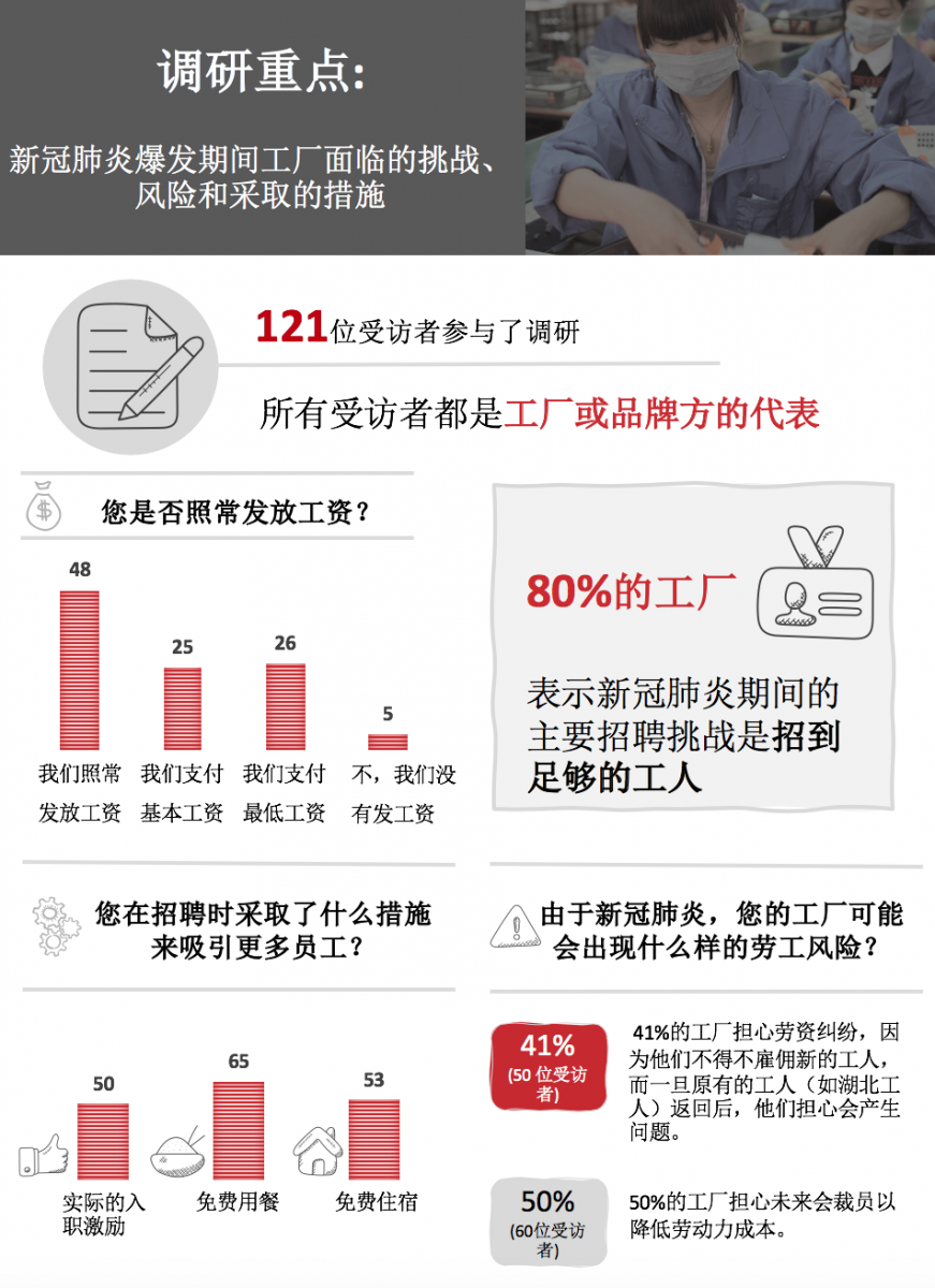 为了在这个充满挑战的时期为工厂提供帮助,瑞联稚博于2020年3月17日为中国供应商举办了免费的网络研讨会,旨在分享有关负责任招聘实践的实用方法和措施。178名参与者参加了这场一个半小时的研讨会,讨论了工厂当前面临的主要挑战和风险,以及他们可以针对这些挑战和风险采取的实际行动。所涉及的议题包括如何扩大招聘渠道、鼓励工人复工并加强与临时工/短期工、劳务中介和劳务派遣机构等有关的管理程序;还包括加班管理和工资协商;以及如何预防招聘未达法定工作年龄的人员。