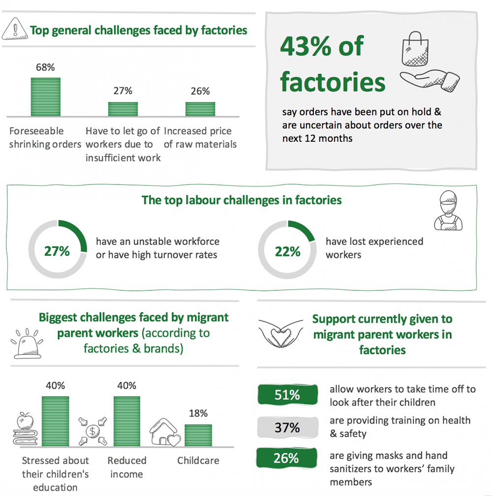 The need for brands and their suppliers to adapt to the new situation and support migrant parent workers is therefore greater than ever before. It is in the interest of all factories – even those with reduced orders – to retain their most skilled, experienced workers during this time. Supporting migrant parent workers is one of the most effective ways of doing so.