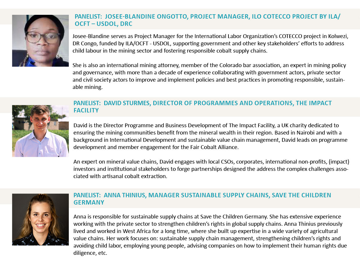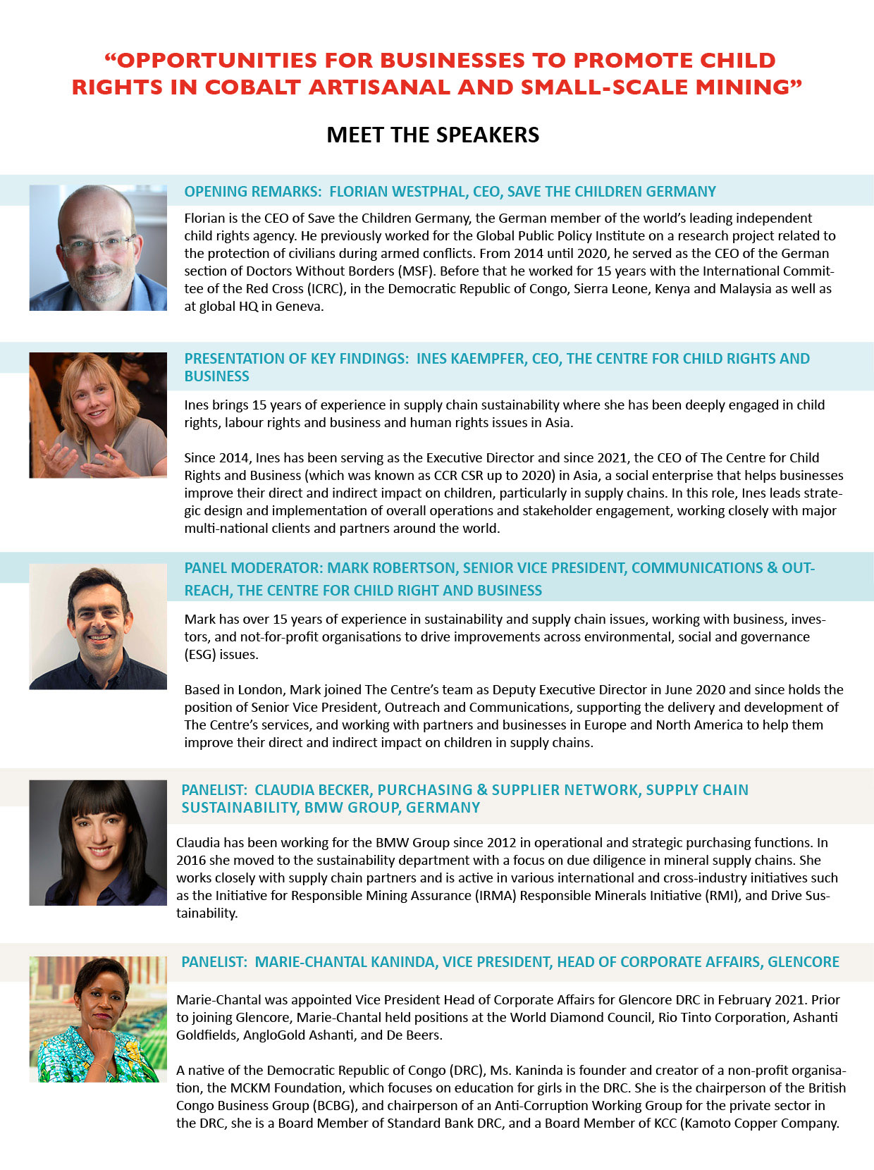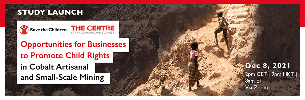 The Centre for Child Rights and Business (The Centre) and Save the Children are jointly launching a study called “Opportunities for Businesses to Promote Child Rights in Cobalt Artisanal and Small-Scale Mining” on Dec 8 at 2 p.m. CET (9 pm HKT, 8 am ET). This study sheds light on the current situation of children in cobalt Artisanal and Small-Scale Mining (ASM) communities and the opportunities for companies to improve child rights.