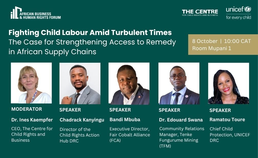 On October 8, 2025, The Centre for Child Rights and Business (The Centre) and UNICEF will co-organise a hybrid session at the 4th African Business and Human Rights Forum in Lusaka, Zambia, titled “Fighting Child Labour Amid Turbulent Times – The Case for Strengthening Access to Remedy in African Supply Chains”.