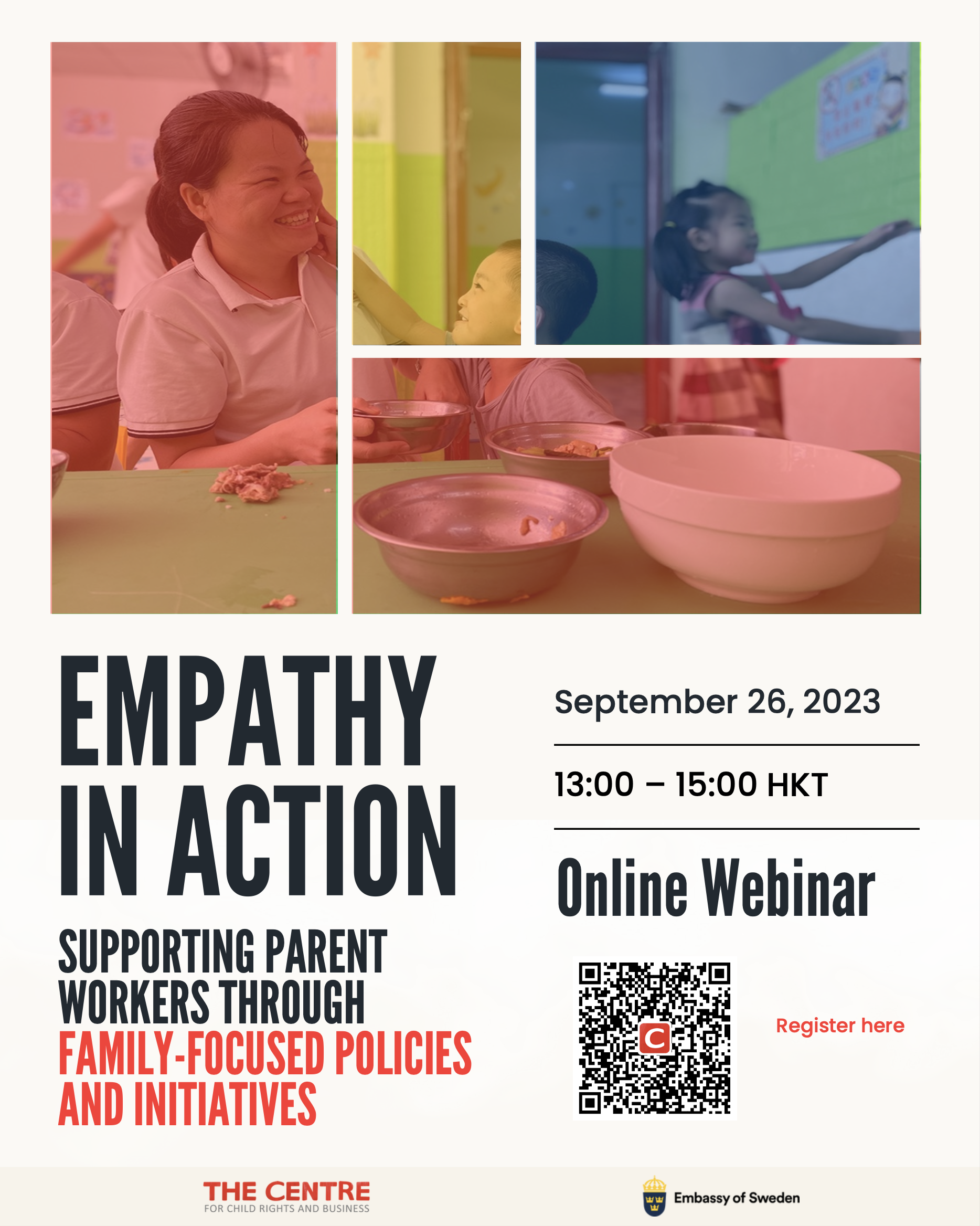Parent workers, including migrant parents, are a prominent part of supply chains. However, as parents they face a unique set of challenges that impact them, their families and their workplaces. Join us on September 26 at 1 p.m. HKT (7 a.m. CET) for a discussion hosted by The Centre for Child Rights and Business and the CSR Centre at the Embassy of Sweden in Beijing. Explore how businesses can implement family-friendly initiatives in their supply chains to support parent workers while reaping long-term business benefits.