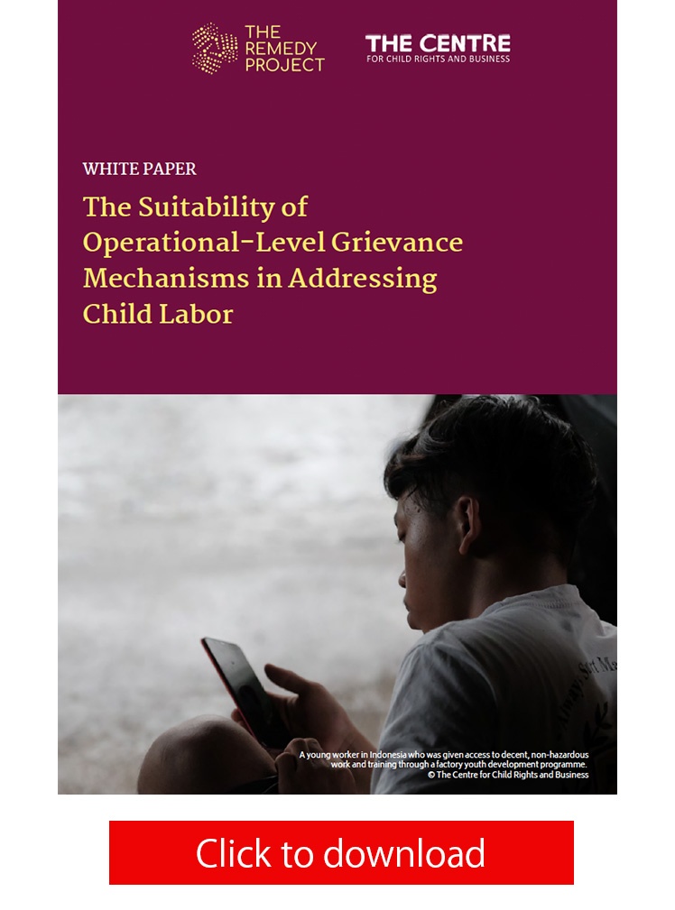 The Remedy Project and The Centre for Child Rights and Business (The Centre) are proud to announce the release of a new white paper that examines the effectiveness of Operational-level Grievance Mechanisms (OGMs) in addressing child labour. “The Suitability of Operational-Level Grievance Mechanisms in Addressing Child Labour” also aims to provide businesses with actionable insights to better address and remediate child labour within their supply chains.